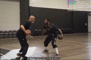 欧文直播运球训练 菲尔·汉迪陪练 训练用球比普通篮球小好几个号