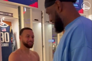 人气王!库里光着膀子与詹姆斯&唐斯&约基奇致意 字母、077也交流