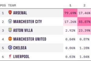 机构仍然较为看好阿森纳夺冠,相比之下,曼城目前的夺冠概率为17.26%。