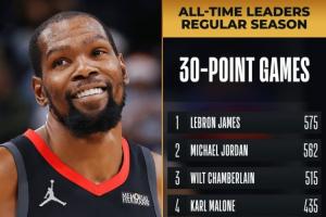 这是杜兰特生涯第430场得分30+,升至NBA历史第6,还差1场就能追平科比。