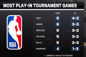 出战附加赛场数榜:热火老鹰6场最多 勇士4场 本赛季仍在附加赛区