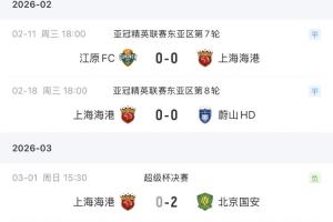 2026年海港进行了3场正式比赛,亚冠两场均为0-0平,本场0-2负,三场比赛都没有进球入账。