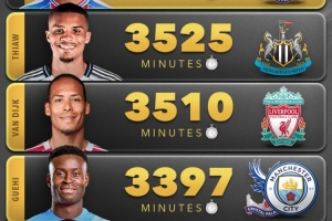 本赛季五大联赛非门将球员出场时间榜:范戴克3510分钟第三