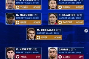 体育资讯11月23日讯 阿森纳将在本轮英超焦点战对阵热刺,《转会市场》统计显示队内最多可能有8人无法出战。