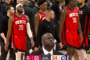 吓人!阿门退防时被理查兹顶倒 头部重重摔倒地板上&下场缓缓