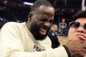 体育资讯11月25日讯 NBA常规赛,勇士134-117战胜爵士。比赛中,中国歌手揽佬SKAIISYOURGOD现身场边,给勇士助阵。