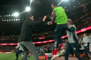 当埃泽第76分钟破门,上演帽子戏法帮助阿森纳4-1领先热刺时,原本在热身的斯凯利冲向教练席高高跃起振臂欢呼,随后他和阿尔特塔为首的教练组相拥庆祝,替补席上的多名队员随后也加入庆祝。