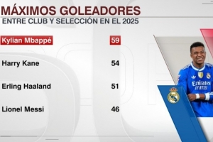 足坛2025年进球榜:姆巴佩59球居首,凯恩、哈兰德、梅西紧随其后
