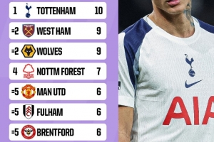 体育资讯12月1日讯 在本轮英超,热刺主场1-2不敌富勒姆。OPTA盘点了2025年英超主场失利场次榜,具体如下: