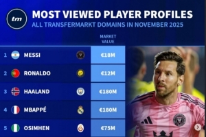 11月德转球员页面浏览量排名:前三依次为梅西、C罗、哈兰德