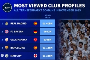11月德转俱乐部页面浏览量排名:皇马、拜仁、加拉塔萨雷前三