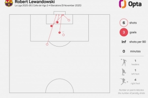 据Opta统计,37岁80天的莱万是本世纪西甲第三年长的戴帽球员,仅次于若热-莫利纳(39岁241天)、华金-桑切斯(38岁140天)。