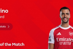 传射建功!英超官方:梅里诺当选阿森纳2-0布伦特福德全场最佳