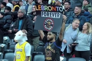 屠龙高手!詹姆斯球迷赛前在猛龙主场打出“勒布伦多”的标语