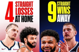 反着来🤣 掘金目前主场4连败 客场9连胜