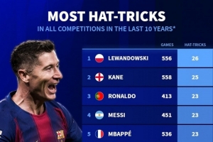 体育资讯11月10日讯 德国转会市场统计了近10年前十联赛球员的戴帽次数,并列出榜单。