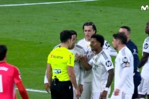 比赛补时阶段,主裁金特罗·冈萨雷斯先是向抗议的卡雷拉斯出示黄牌,随后又直红将其罚下场,多名皇马球员立即围向裁判抗议。