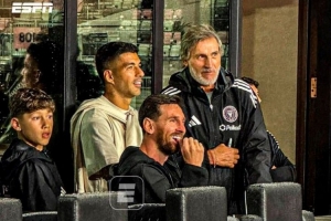 梅西组织的青少年锦标赛“梅西杯”在迈阿密开幕,梅西与苏亚雷斯来到现场,观看巴萨对阵河床的青训梯队比赛。