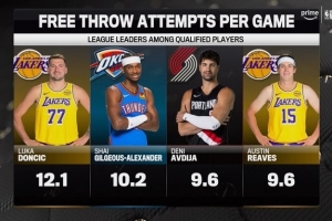 转播方晒罚球前四:东契奇12.1次 SGA第2 阿夫迪亚/里夫斯并列第3
