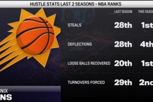 太阳抢断本赛季联盟第1&上赛季第28 活球争抢本季第1&上赛季第20