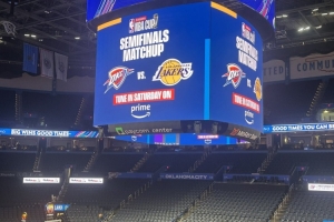 在雷霆比赛的中途,俄城大屏幕预告NBA杯半决赛雷霆vs湖人,结果湖人被淘汰了。