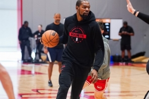 火箭官方发布了球队训练照,全员状态轻松,杜兰特眼神专注。