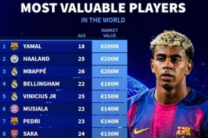 德转身价top15:亚马尔、哈兰德、姆巴佩2亿欧并列第一
