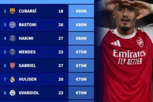 体育资讯12月13日讯 德国转会市场公布了新一期的球员身价情况,在后卫方面,萨利巴以9000万欧居首,库巴西、巴斯托尼、阿什拉夫均8000万欧。