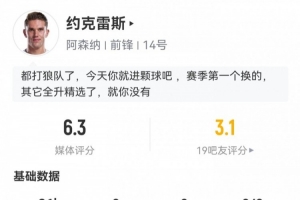 约克雷斯数据:首发战狼队81分钟15次触球1射0正,评分仅6.3