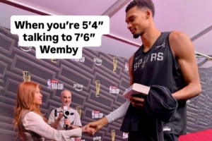 普通人视角!女记者晒与文班亚马握手照:1米63和2米32
