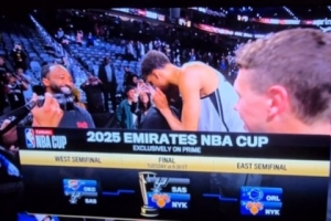 本场比赛保罗来到现场观战两个老东家的对决,比赛结束后,文班亚马和保罗耳语了一番,随后两人击掌庆祝。