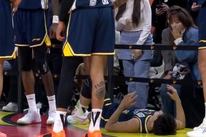 邬挺嘉劈叉投篮将扑防的徐杰绊出场外 后者倒地不起&返回更衣室