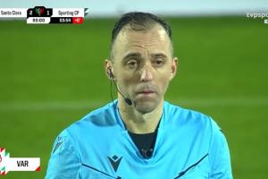 比赛第90分钟,1-2落后的葡体任意球进攻,队长尤尔曼德在对手禁区内倒地,主裁判没有判罚,但VAR介入。