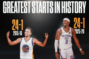 雷霆目前3场2负,值得一提的是,15-16赛季的勇士也出现过3场2负(客场输给掘金和活塞)。