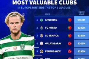 体育资讯11月11日讯 德国转会市场盘点了五大联赛之外的欧洲球队身价,葡萄牙体育4.57亿欧元排名第一。