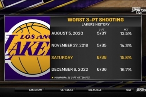 湖人全场三分球38中6 命中率15.8%&在队史35+出手的比赛里第三低
