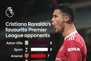C罗在英超联赛中最“偏爱”的对手榜: