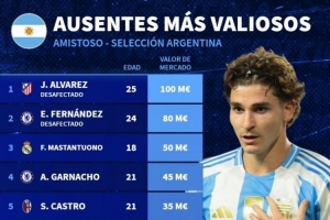 缺席本期阿根廷队球员身价榜:小蜘蛛1亿欧居首,恩佐8000万欧