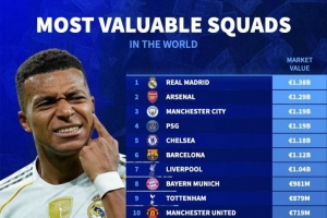 俱乐部德转身价排名:皇马13.8亿欧居首,阿森纳、曼城、巴黎前四