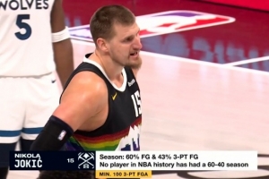 真是恐怖!约基奇本赛季60%命中率&43%三分命中率 此前无一人做到