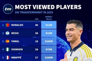 2025年德转球员信息浏览量排名:C罗居首,梅西、亚马尔二三位