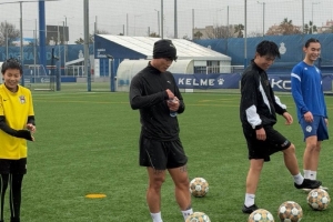 国脚谢文能现身西班牙人训练基地,韩德宝等小将一同参与训练