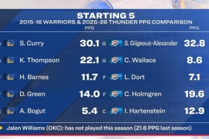 16勇士和本季雷霆首发对比:库里30.1分克莱22.1 SGA32.8切特19.6