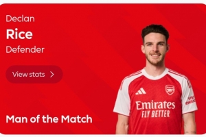 客串右后卫收获MVP!官方:赖斯当选阿森纳2-1布莱顿的全场最佳
