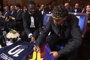 2025金球奖冠亚军!亚马尔、登贝莱在环足奖典礼互赠签名球衣