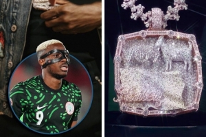 据介绍,这条项链委托珠宝商Benny The Jeweler打造,由14000颗宝石镶嵌而成,共986克拉,项链总重近1.5公斤。项链正面镶嵌着一只山羊(goat),饰有奥斯梅恩的名字首字母和球衣号码“VO9”,下方是绿色黄金打造的尼日利亚国旗,并叠印女儿海莉的名字。项链背面刻有设计师的签名,该品牌在社媒展示了这款项链,配上“MVP”字样缩写,项链上面还点缀了微型足球图案。