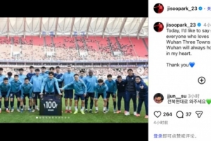 朴志洙在社媒晒出此前领取百场纪念球衣的照片,并配文写道:“今天,我要向热爱武汉三镇的各位道别。三镇将永远在我心中有着特殊的位置。谢谢。”