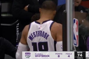 刚热就得下了!威少刚投进本节第二记三分 下回合犯规4犯下场休息