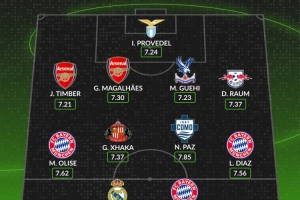 后卫:廷伯(阿森纳)、加布里埃尔(阿森纳)、格伊(水晶宫)、劳姆(莱比锡)