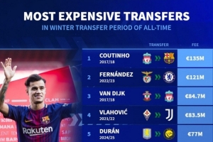 冬窗最贵转会榜:库蒂尼奥1.35亿欧居首,恩佐1.21亿欧次席